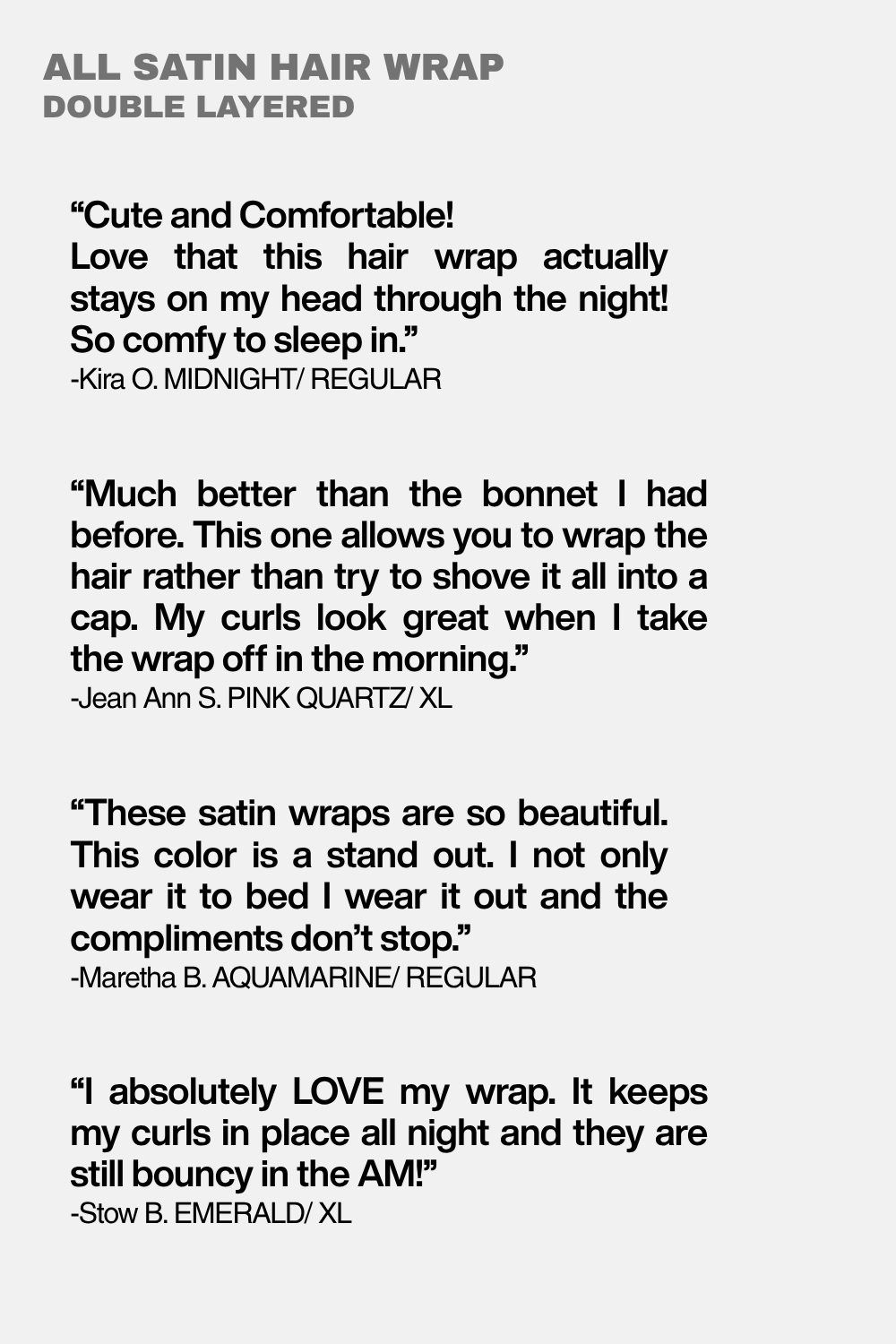 | All Satin Wrap | Thick, curly, voluminous hair | Heavy satin | Shoulder to mid-back | Regular & XL | Structured, stays put overnight |